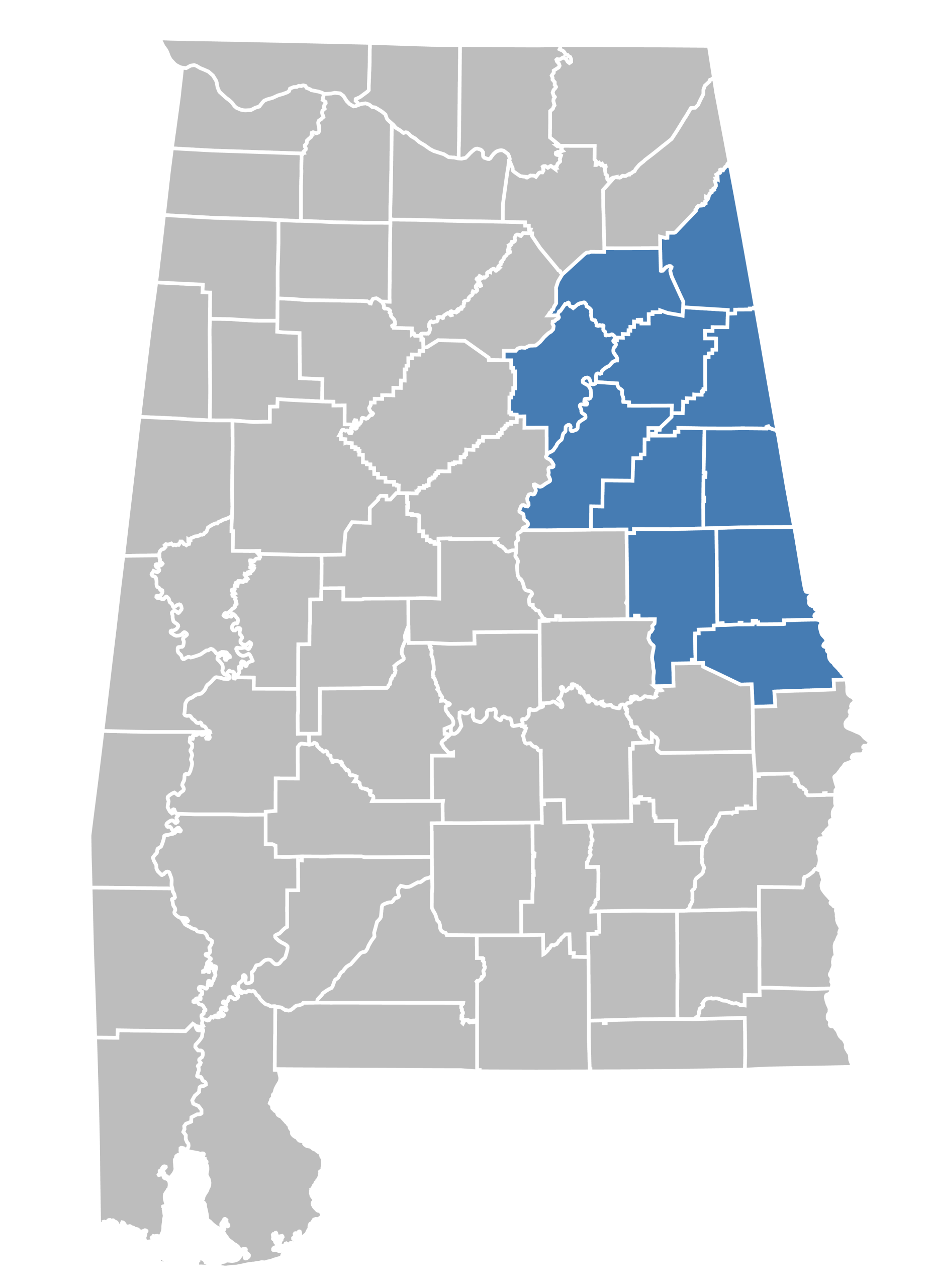 CalhounChambersCherokeeClayCleburneEtowahLeeRandolphSt. ClairTalladegaTallapoosa
